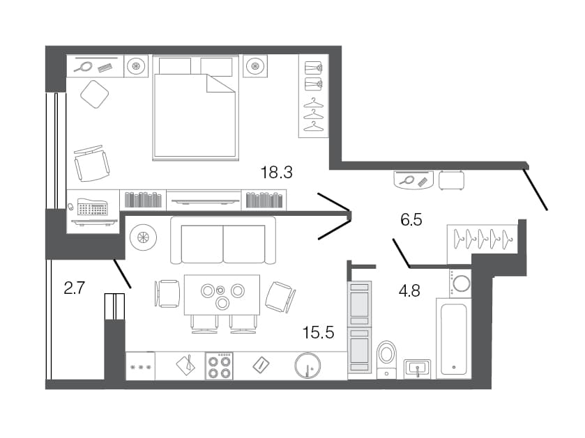 Вариант 4 — просторная 45-метровая квартира с нестандартной формой