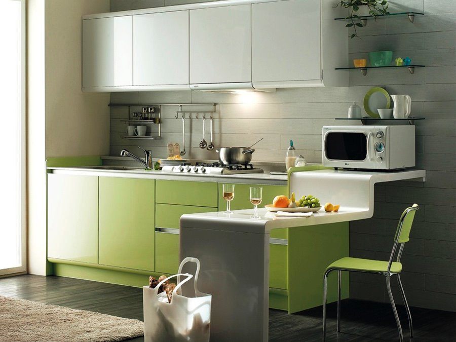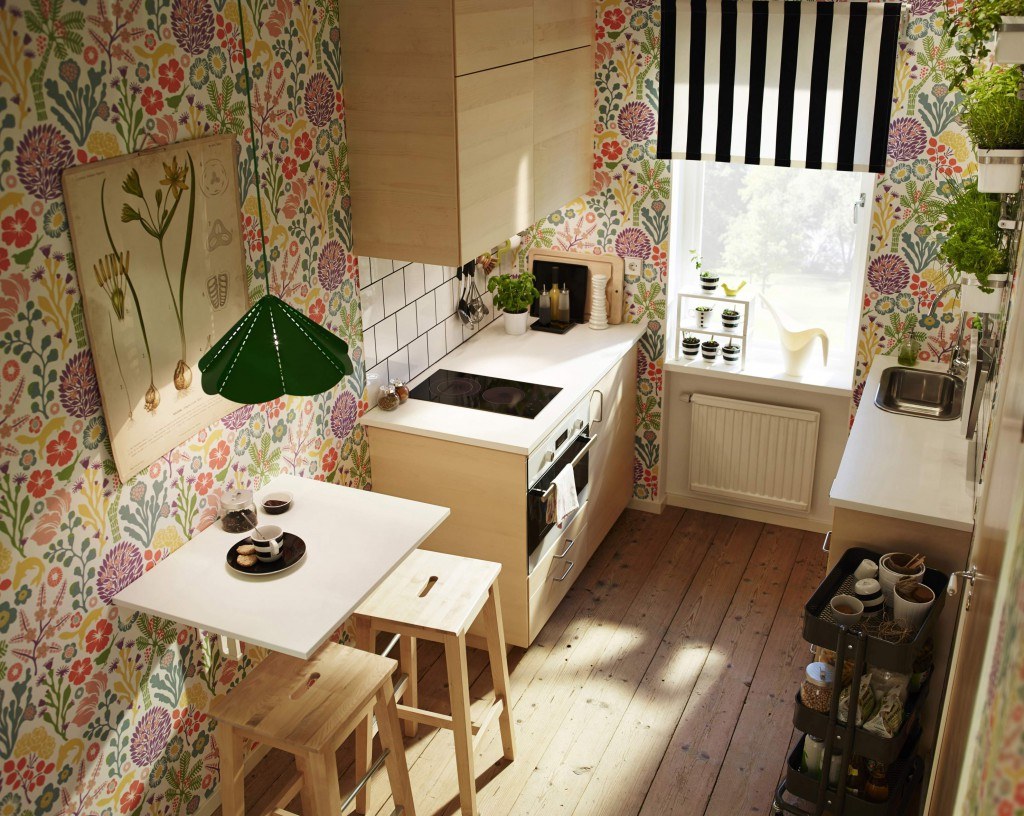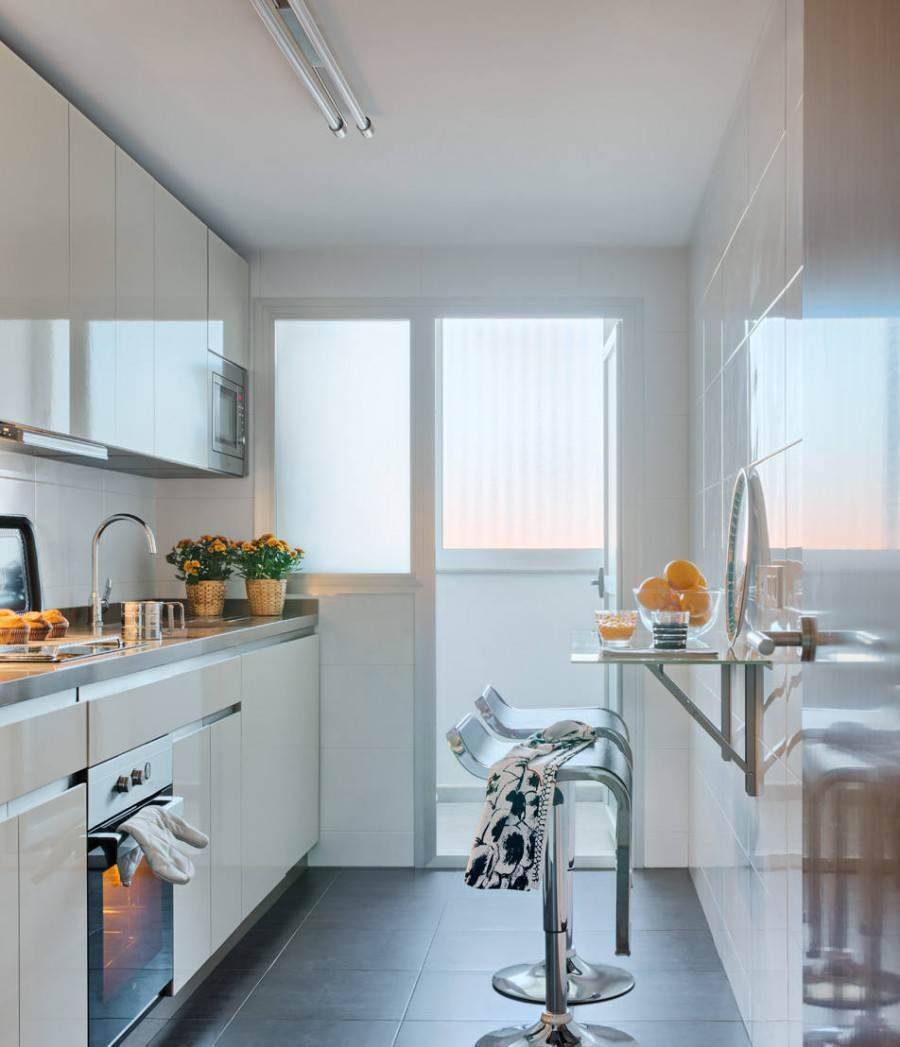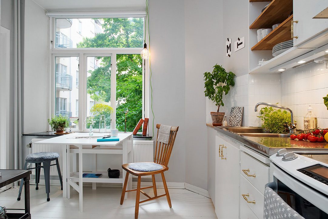 Идеальным вариантом станет барная стойка, навесная узкая столешница или мебель-трансформер. Подобное решение удобно, так как стол не занимает много места. В линейной и параллельной планировке лучшим местом для него является незанятая стенка с окном, где столешница заменяет собой подоконник. Если оставить достаточно свободного пространства между кухонным гарнитуром и перпендикулярной стенкой, можно удачно поместить маленький диванчик, оборудовав еще и зону отдыха. Даже в однорядной кухне можно с пользой использовать свободные стены, повесив съемную столешницу. И не нужно ставить громоздкие стулья: достаточно небольших табуреток, которые всегда можно спрятать под столик.