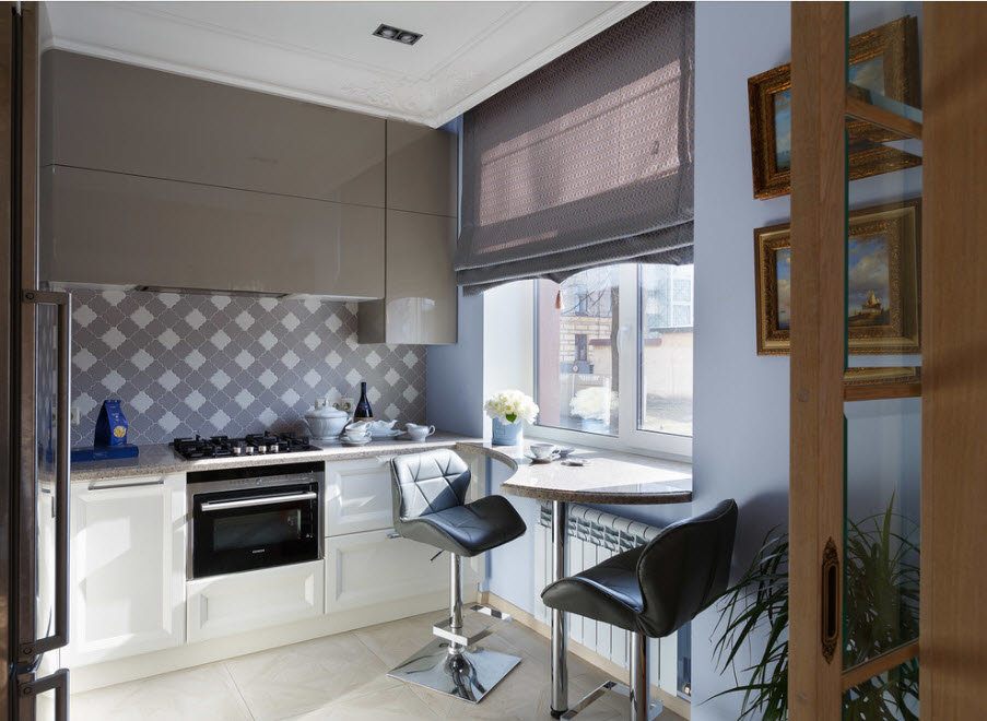 Для сохранения полезной площади устанавливают барную стойку или раскладным обеденным столом. Также можно в качестве обеденного стола или рабочей поверхности использовать переоборудованный подоконник.