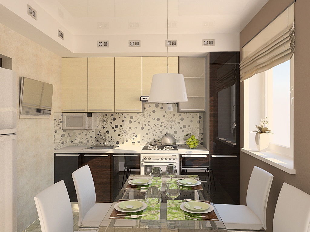 Универсальным решением для создания стильного дизайна маленькой кухни является декорирование окна жалюзи, современными римскими шторами, рулонными моделями или воздушными полупрозрачными гардинами из синтетических тканей, например полиэстера, лавсана или нейлона. Уместно применение, как светлых однотонных занавесок, так и с мелкими узорами.