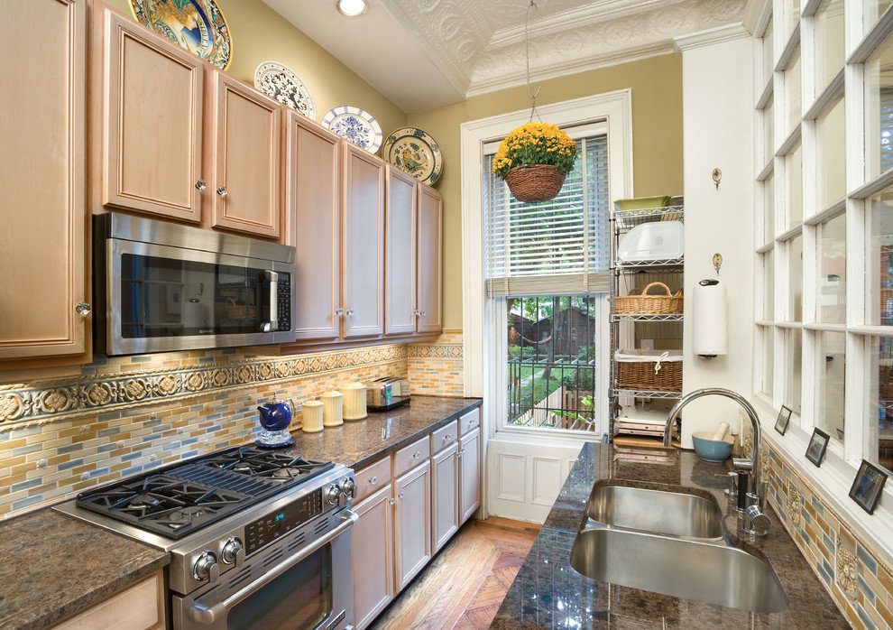 - Для линейной узкой кухни рабочие элементы лучше всего размещать в порядке холодильник-раковина-плита, что интуитивно подсказывает порядок действий (достать продукты, помыть и приготовить).