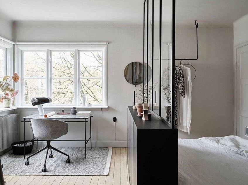 фото современного интерьера небольшой спальни с перегородкой, кабинетом и окнами