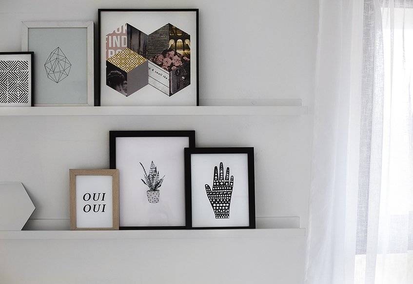 Идеальная симметрия не всегда должна быть целью. Учитывай это, выбирая формы для рамок и место расположения картин. Одно вертикальное фото на тумбочке слева и горизонтальное изображение на стене справа будут смотреться красиво и современно.