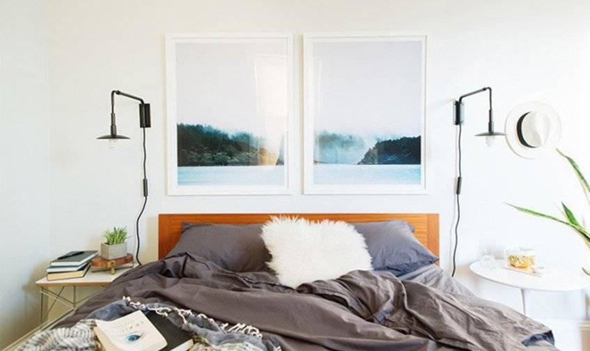 Две картины над кроватью тоже впишутся гармонично. Вот такой диптих можно сделать своими руками. Возьми одно фото в высоком разрешении, разрежь его пополам и вставь в рамки каждую из частей. Драматичная композиция украсит комнату, предаст ей расслабленный, прохладный вид.