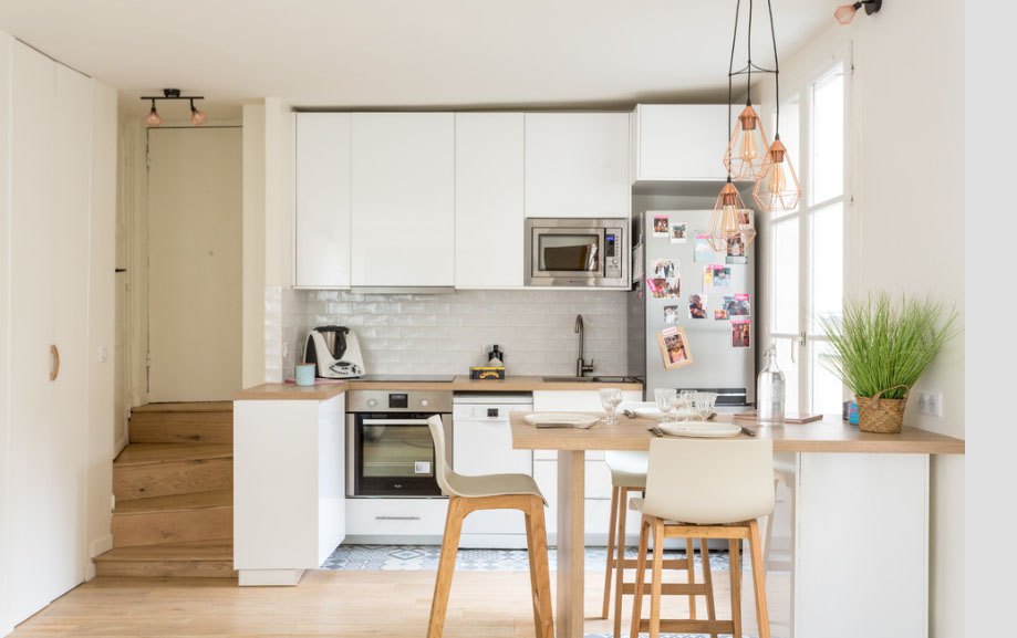 В квартирах с небольшой площадью (до 35м2) стоит комбинировать некоторые объекты. К примеру, подоконник может служить барной стойкой. Он займёт совсем мало места, зато будет фантастически выглядеть и функционально работать.