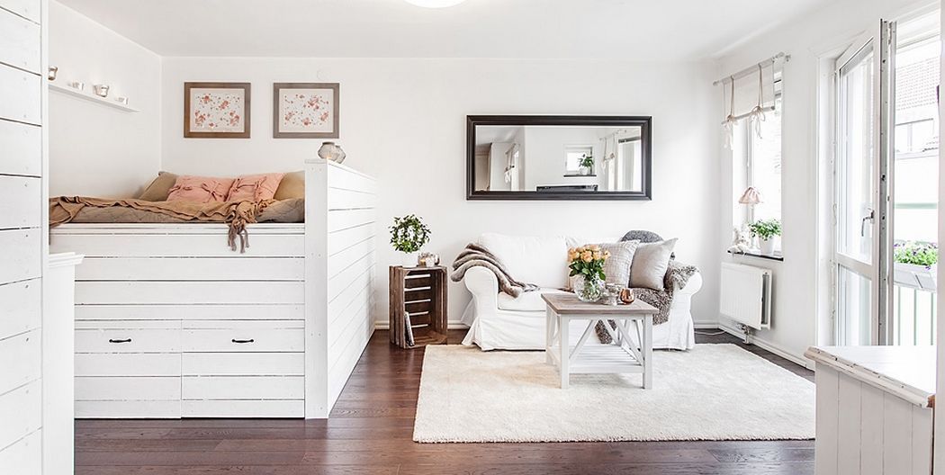 На небольшой площади важно сохранить ощущение свободного пространства. С этим отлично справляется мебель: диван или стол, приставленные к стеллажу, высокое изголовье кровати. Зонировать комнату можно с помощью разных уровней пола: например, вынести рабочее или кухонное пространство на подиум.
