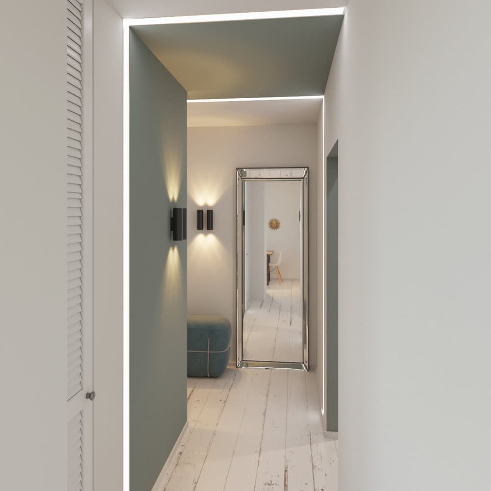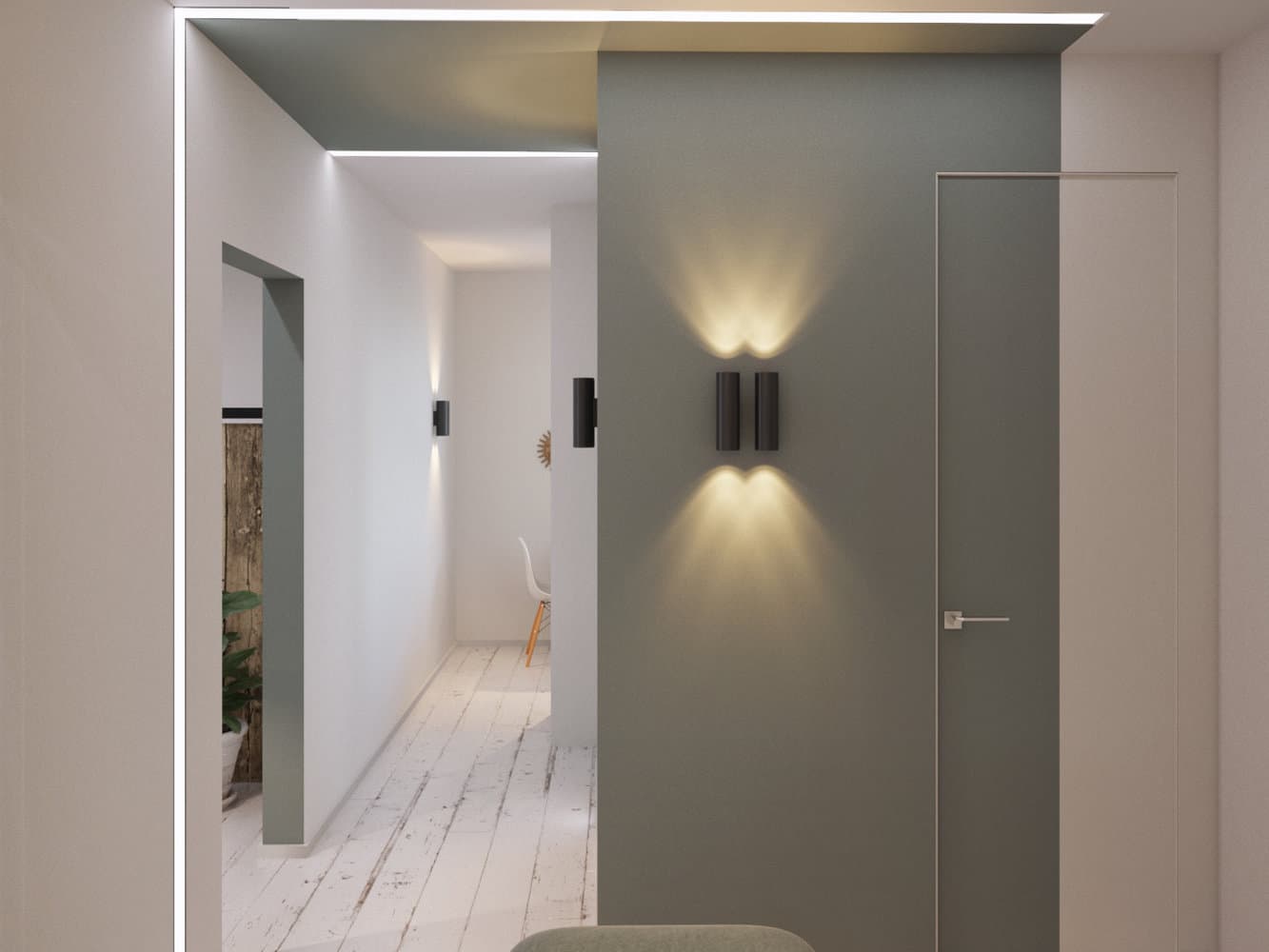 В этом случае гостиная становится проходной, а участок прихожей можно использовать в различных целях: продлить ванную либо оборудовать здесь кладовку или гардеробную.