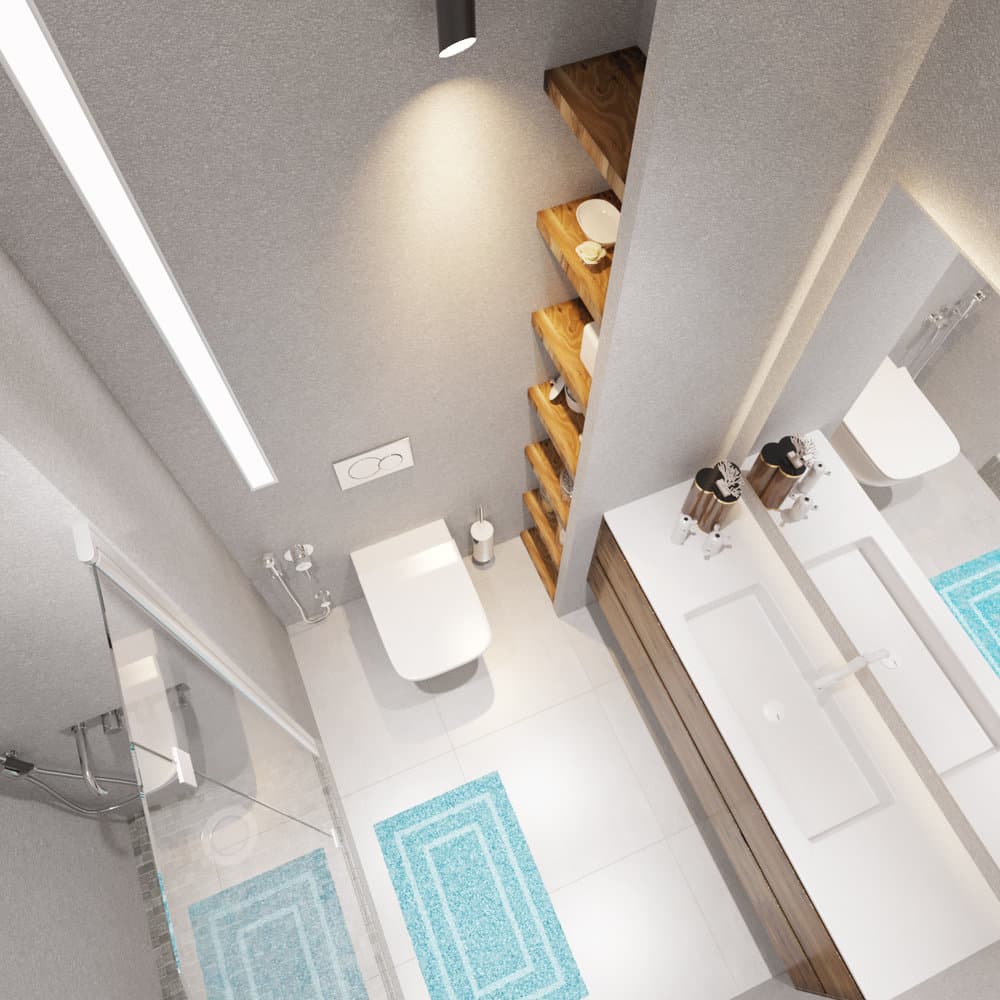 Если смонтировать душевую кабинку на месте унитаза, высвобождается значительная часть пространства в противоположном углу. Здесь размещают угловую столешницу и встроенную раковину. Под ней найдется место для малогабаритной стиральной машины. Унитаз переносим к соседней стене.