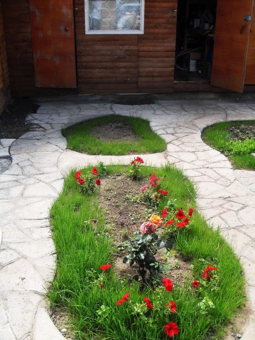 При недостаточном количестве материала, можно на расстоянии шага уложить остатки кирпичей, части бетона или деревянные элементы: спил, полосы, щиты, паркет. Остальную часть земли засеять травой.