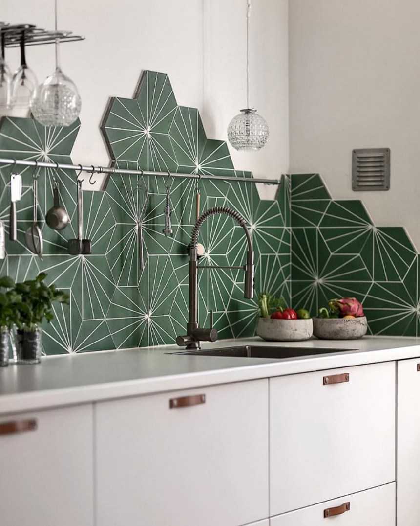 Удачная комбинация салатовой плитки с белыми фасадами и черной столешницей