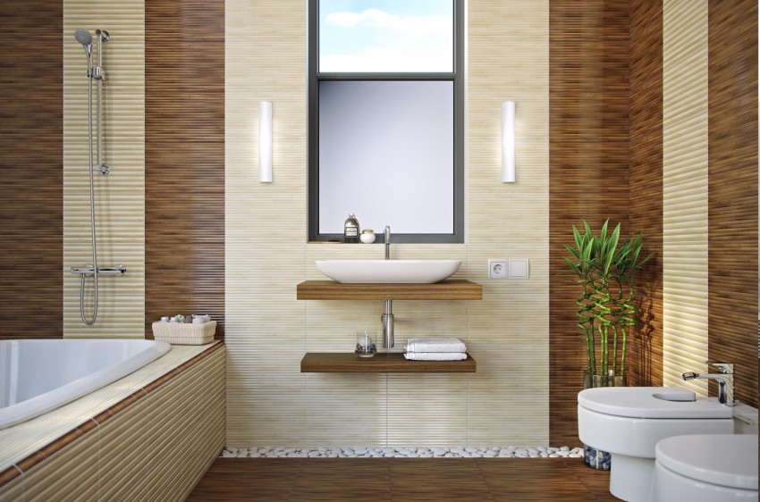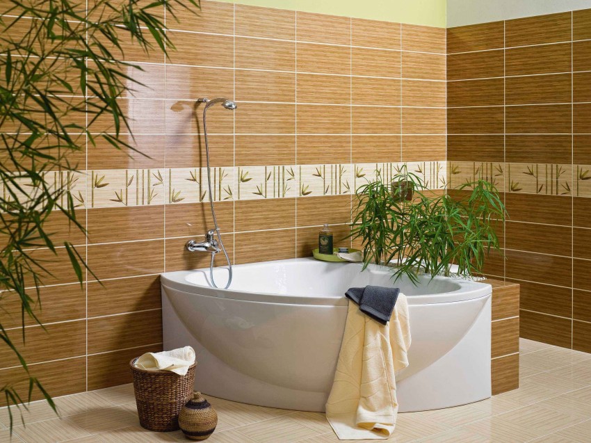 - Дерево. Успешная имитация позволит не нарушать стилистику например, эко-интерьера всей квартиры или дома. Природные цвета способствуют максимальной релаксации, позволяющей проводить аналогию со спа-центром.