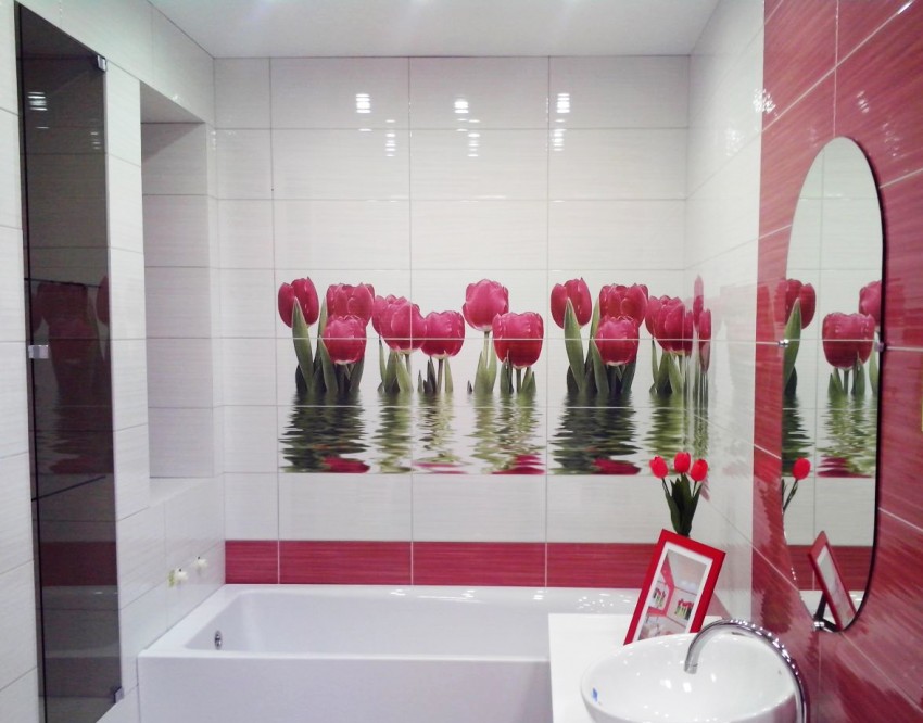Для начала следует определиться, каким именно вы хотите видеть изображение цветов на стенах ванной комнаты. Они могут быть в виде большой картины или в форме орнаментов. Первый вариант можно сравнить с фотообоями, только приспособленными для влажного помещения. Подобная отделка выглядит как большое панно из керамической плитки с фотографиями цветов. Обычно такую картину устанавливают над ванной чашей, а ее размер подбирают в зависимости от общего метража помещения. Различают панно нескольких типов: