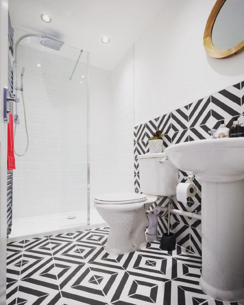 В данном случае оптимальным вариантом будет комбинация однотонных оттенков с плиткой, на которой изображен рисунок.