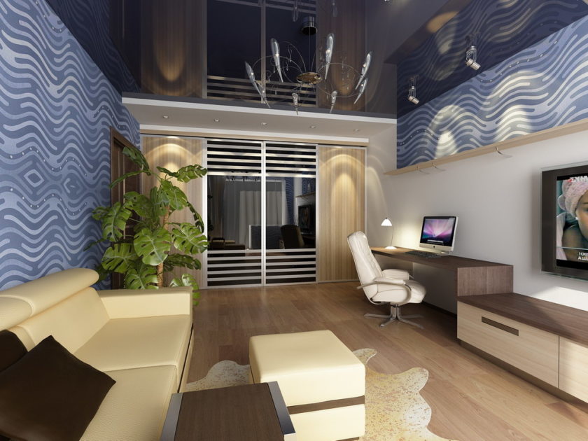 Тут мы уже видим немного глянца, поэтому в модерне отлично смотрятся синие, белые и черные натяжные полотна. Неизменным остается применение обоев.