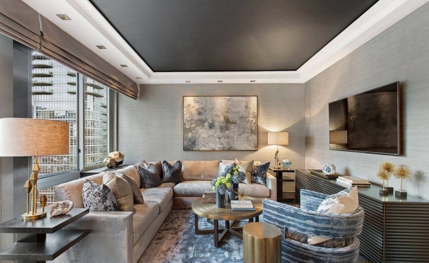 Выбирая вид будущего потолка и самой гостиной, можно следовать модным тенденциям, применяемым в оформлении.