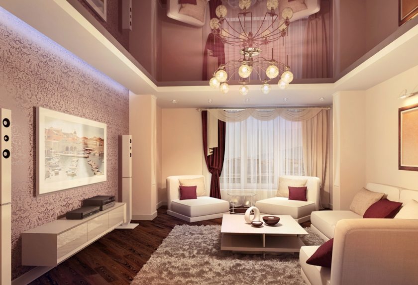В маленьких гостинных хорошо будут смотреться яркие глянцевые или сатиновые потолки. Подберите оттенок в тон стенам или мебели, разместите несколько источников освещения… Вы удивитесь, когда увидите, насколько увеличится ваша комната.