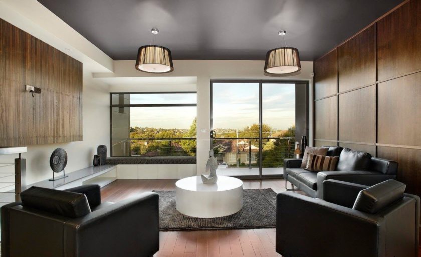 В дизайне помещения этот стиль также зиждется на минимализме. Здесь наблюдается однотонный цвет поверхностей, отсутствие лишних элементов и декораций. Дизайн потолка в гостиной может основываться на однотонной покрашенной поверхности или отделке из искусственного кирпича.