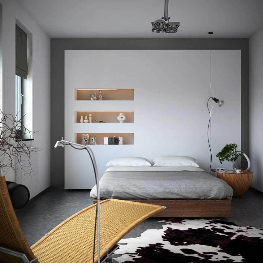 - Минимализм подходит для варианта, когда спальня выполняет исключительно свою основную функцию. В интерьере комнаты расположена только кровать с двумя прикроватными тумбами.