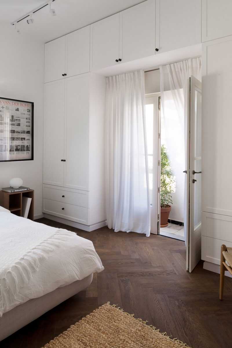- Когда дверь находится в стене напротив кровати, рационально использование встроенной мебели вдоль всей боковой стены. Минус – несимметричное расположение элементов в стене с дверью.
