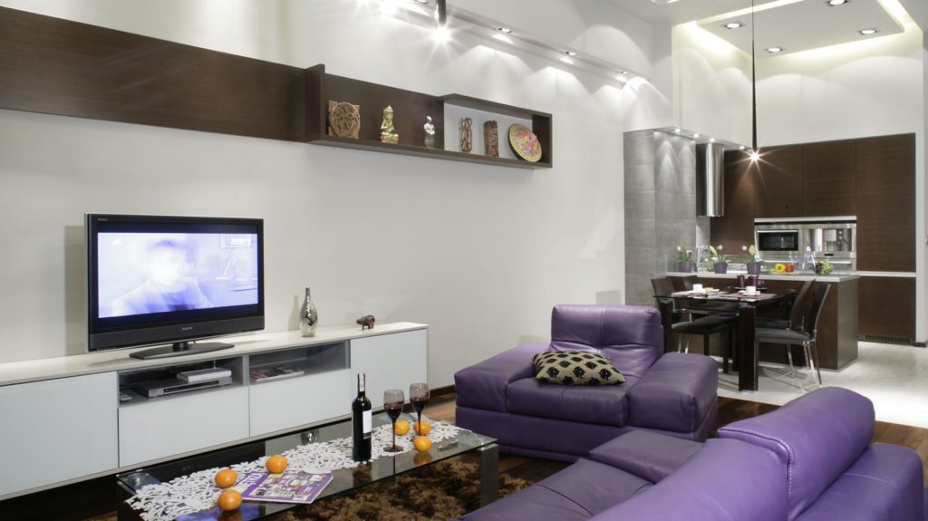 Современный стиль не ограничивает полет фантазии и включает смелые, оригинальные интерпретации фиолетового. Для хай-тека характерны четкие линии и правильная геометрия, дополненная металлическими деталями. Насыщенные краски могут перекликаться с черным, белым, красным тоном, главное, не допустить смешения глубоких тонов в одно сплошное пятно. Следует правильно продумать освещение, чтобы раскрыть чувственность и магию цвета. В современном дизайне удачны будут глянцевые поверхности, а декор следует подбирать минимальный.