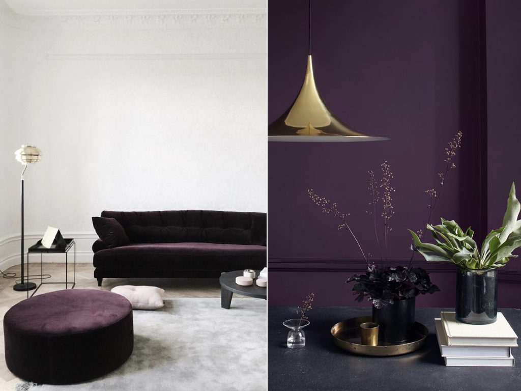 черника, ежевика, слива, баклажан — вкусные, темные оттенки фиолетового — очень модные в этом сезоне. В сочетании с блестящими аксессуарами и хорошо подобранным освещением они создают интригующий, театральный эффект. Они соответствуют интерьерам с атмосферными сумерками.