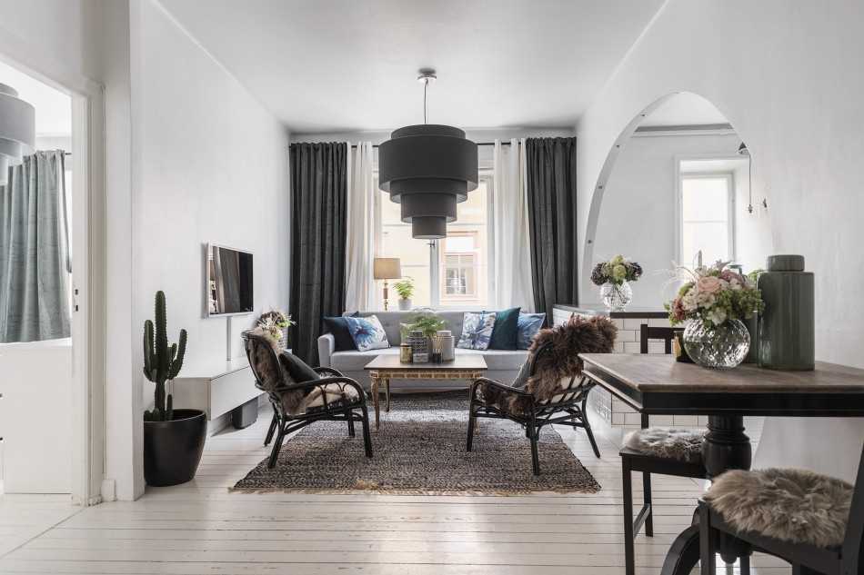 Чтобы квартира выглядела гармонично, нужно выполнить интерьер всех помещений в едином стиле (хайтек, минимализме, стиле лофт, скандинавском стиле, барокко, кантри и т.д.). Некоторые стилевые направления допустимо соединять, но делать это нужно только после консультации дизайнера. Чтобы интерьер выглядел величественно и достойно, можно основным цветом выбрать белый и разбавлять его различными цветными пятнами. Насыщенные оттенки сделают дизайн законченным. Отделка стен должна быть простой и лаконичной. Лишние узоры и лепнина только мешают в небольших комнатах. Для небольших однокомнатных или двухкомнатных квартир идеально подойдет скандинавский стиль. Интерьеры, выполненные в этом стиле, смотрятся достаточно просто, но чрезвычайно уютно. В небольших помещениях лучше всего смотрятся такие сочетания цветов: