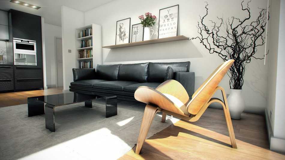 Барные стулья и барная стойка на кухне визуально отгородят ее от остальной части квартиры. Большой мягкий диван может служить центром отдыха и развлечения. Деревянный стол и удобное кресло выделят зону работы. Использование мебели-трансформера даст возможность по максимуму освободить свободное пространство, визуально сделав квартиру просторнее.
