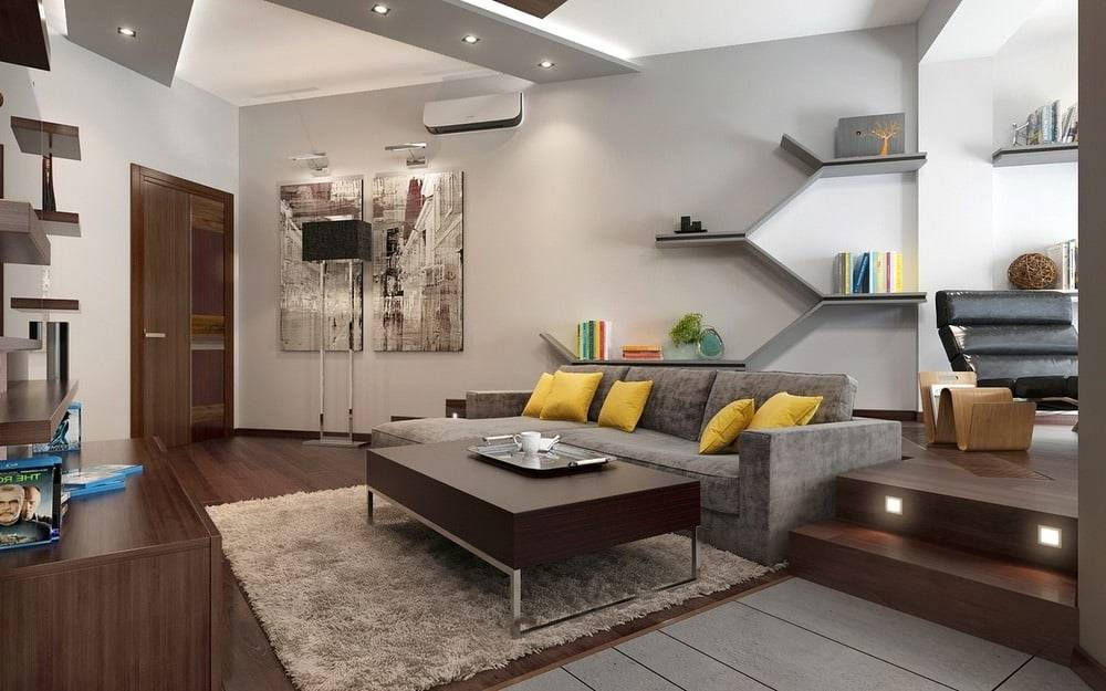 Для обустройства зала выбирают только самую необходимую меблировку, в виде дивана, журнального столика и различных систем хранения. Рациональное решение представляют собой угловые конструкции, эффективно использующие неактивное пространство и сохраняющие место для перемещения в комнате.