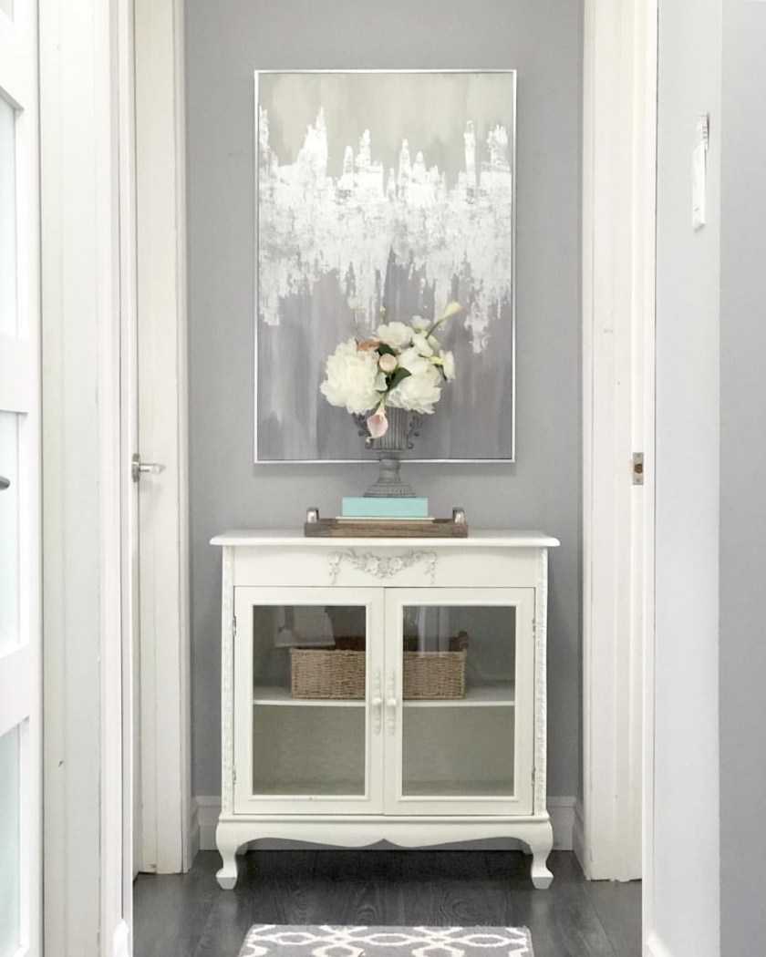 Можно повесить туда зеркало или современное панно. Картина должна быть достаточно светлой, соответствующей общему стилю прихожей, а ее рама на один-два тона темнее цвета стен.