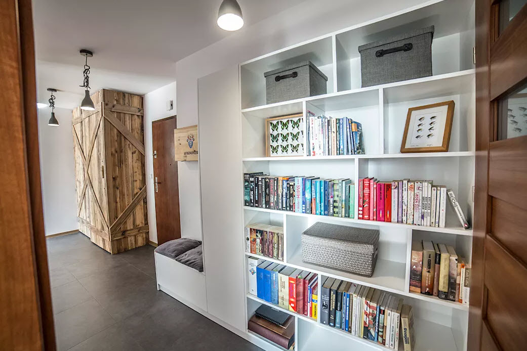 Еще один популярный вариант, когда речь заходит о расположении прихожей, — это встроенный шкаф. Данное решение, несомненно, дороже, но оно также имеет много преимуществ. Прежде всего, индивидуальный гардероб может быть идеально приспособлен к вашим потребностям и параметрам комнаты. Также нет ограничений при выборе фасадов гардероба. Дверь может быть сделана из зеркала, стекла, плиты или более смело — материалов, которые напоминают натуральный бетон и даже ткань или кожу.