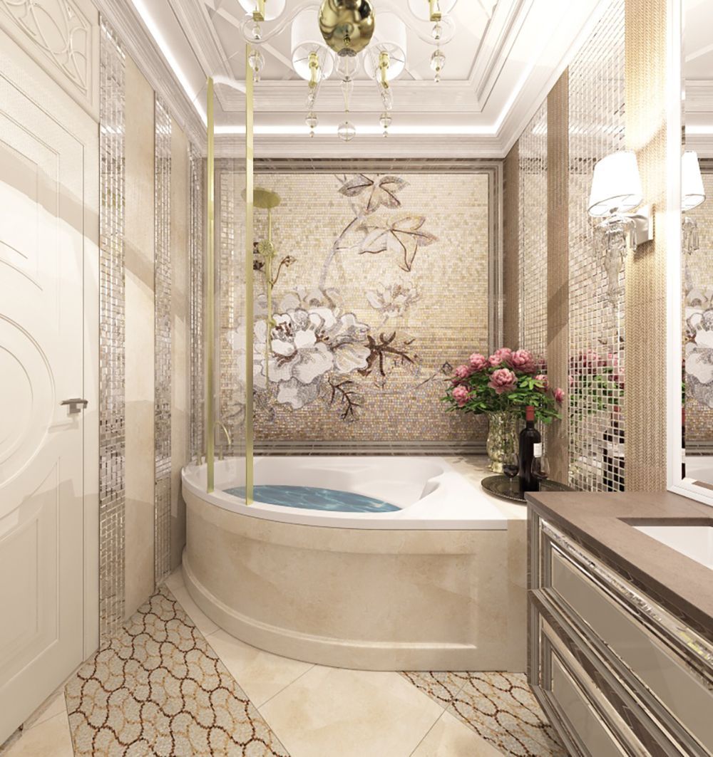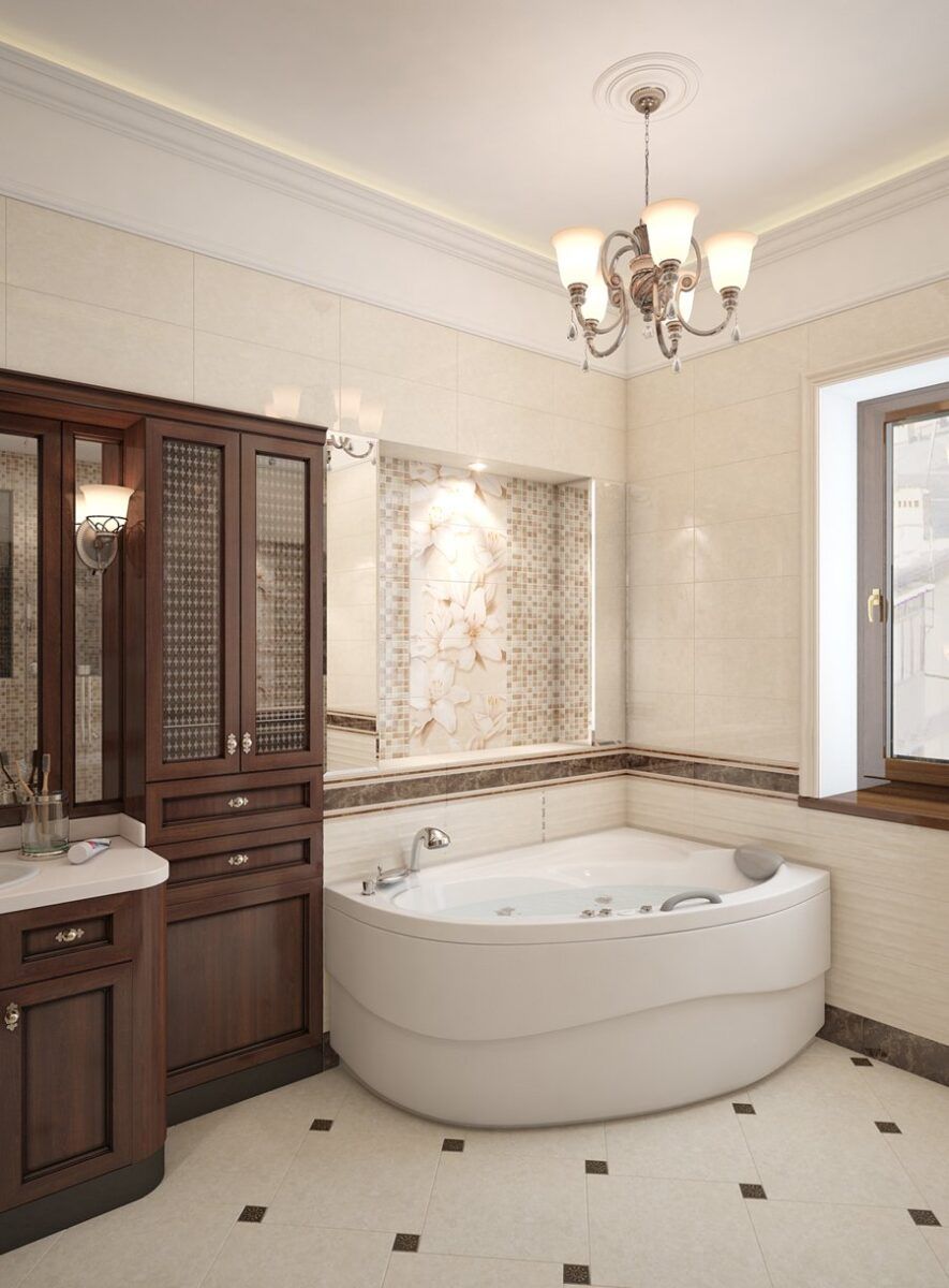 Стиль, в котором угловая ванна смотрится наиболее гармонично – классический. Она может выступать роскошной купальней или, наоборот, ненавязчиво вписываться в интерьер. Чашу в традиционном стиле оформляют мраморной или мозаичной плиткой, вписывают в подиум и даже декорируют колоннами.