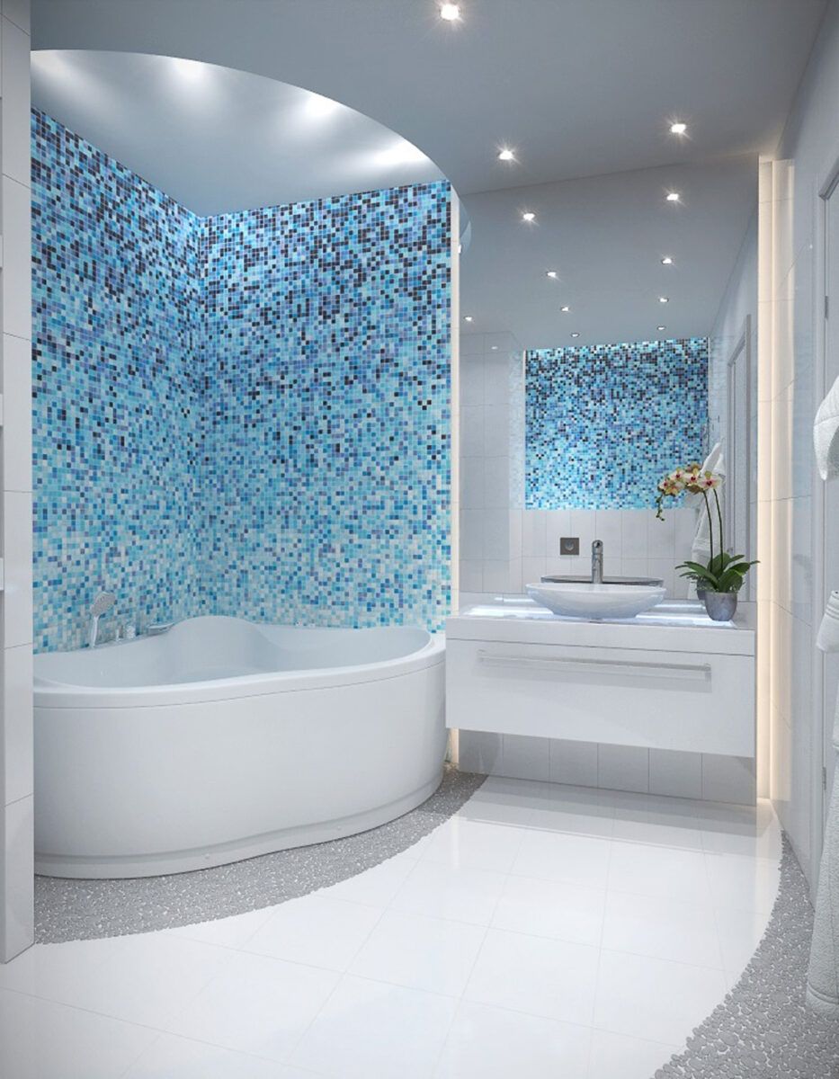 Если дизайн стен и пола с монохромной плиткой слишком однообразен, вы можете привнести в свою ванную комнату немного роскоши. Акценты с блестящими мозаичными вариантами или с элементами сусального золота — настоящие шедевры. Отражением света позволяет дополнительно озарить пространство. Мерцающие мозаичные плитки придают ванной комнате утонченный облик.