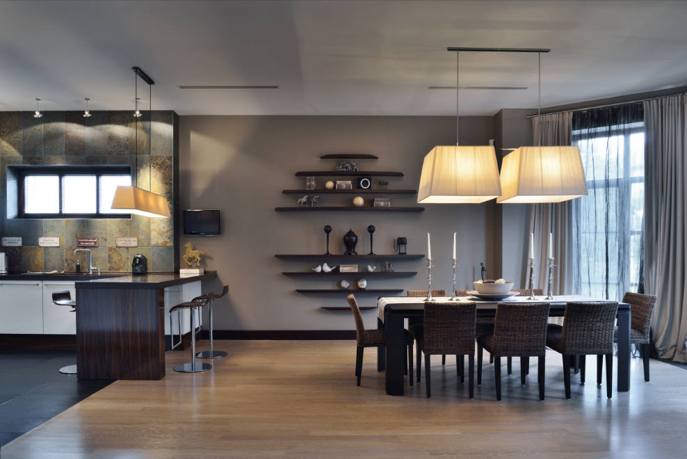 Яркими элементами роскошной лаконичной кухни без излишеств стали барная стойка, оригинальная композиция из полок, благородная отделка из камня а также пару элегантных бельгийских светильников над столовой зоной.