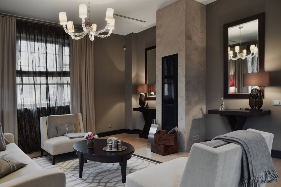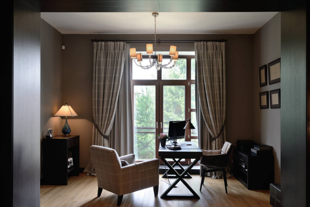 Благородность комнате придаст правильная подборка мебели. Желательно выбирать такую обстановку из ценных пород дерева либо с декоративными элементами металла. Дороговизна оформления будет просматриваться при выборе обивки из: