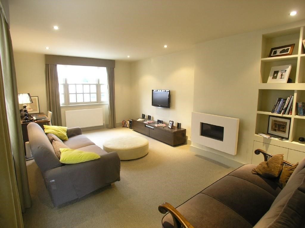 В этом случае группировать диваны и кресла нужно напротив стены, у которой будет расположена тумба для телевизора и остальная аппаратура. По бокам могут быть стеллажи для книг или ниши для декоративных аксессуаров.