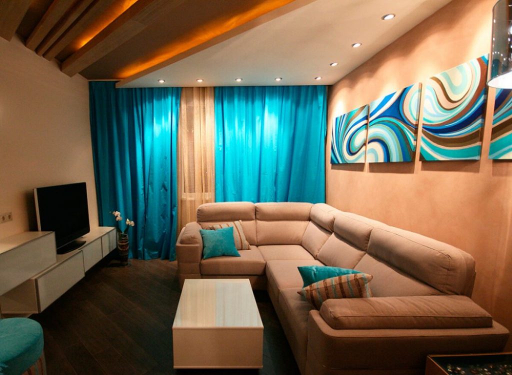 Для многих беспроигрышным вариантом могут стать более спокойные и «мягкие» краски, тем более, зал остается универсальным местом отдыха и расслабления после работы и учебы.