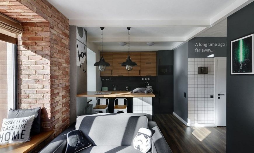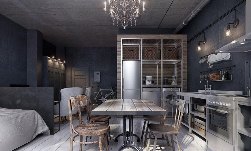 - Лофт – модное направление, которое лучше всего подходит для квартир-студий, т. к. в своей основе несет концепцию открытого пространства. Его характерными особенностями можно назвать нарочито грубые, как будто не отделанные поверхности – бетон, кирпичная кладка либо ее имитация, штукатурка. Все это придает особое очарование помещению, в котором можно ставить как классическую, так и современную мебель. Зонировать пространство проще всего за счет освещения, отделки пола и других подобных приемов.