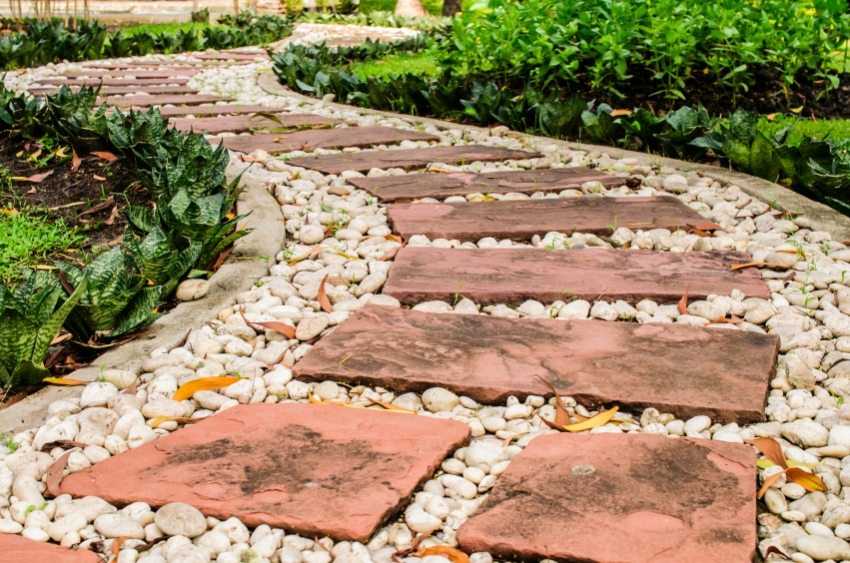 Дизайнерская идея: эффектно смотрятся каменные дорожки, соседствующие с посадками декоративных хвойных кустарников. Камень хорошо комбинируется с галькой, открывая поле для фантазии.