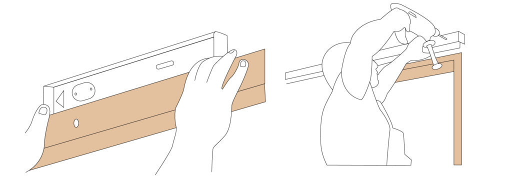 Чтобы смонтировать верхнюю направляющую, к проему ставят полотно. Отмеряют положение двери в закрытом и открытом состоянии. От полученной линии отступают вверх 7 см и проводят горизонтальную черту. Она определяет положение бруса, на который крепится рельс.