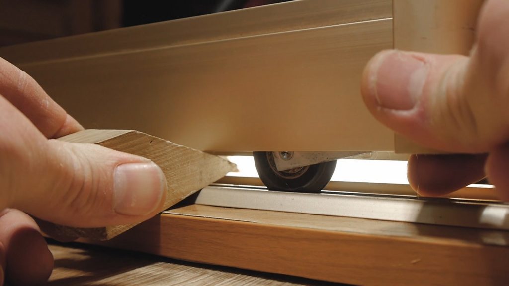 Если нажать на колесо ролика, он уйдет в корпус, затем возвратиться за счет упругости пружины. Этот нехитрый механизм обеспечивает плавность хода двери для шкафа купе.
