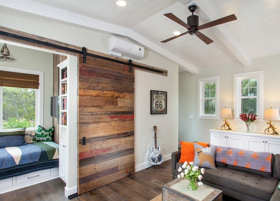 Фурнитура навесных дверей может требовать как работ по врезке, так и просто прикручиваться к поверхности дверного полотна, что очень легко сделать своими руками. Самый распространенный вариант применения, когда цена решения минимальна, предполагает использование межкомнатной двери в роли створки со сдвигом.