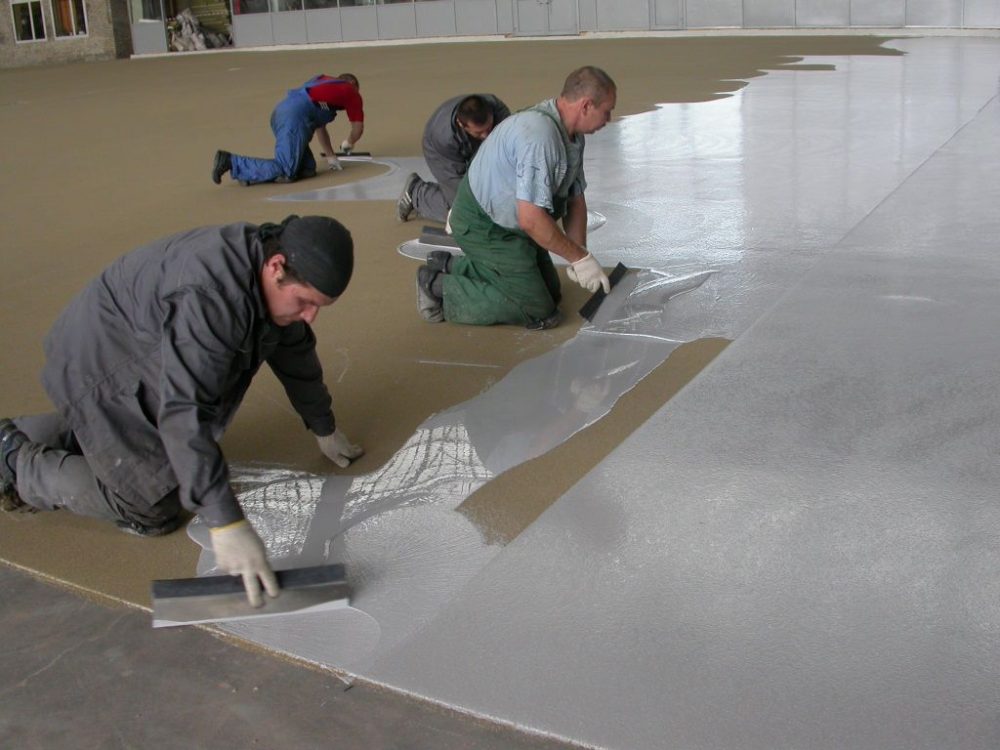 Его разливают по полу из расчета 300-400 г/кв. м. Распределяют состав на основании, а через 20 минут рассыпают кварцевый песок мелкой фракции (около 1,5 кг на 1 кв. м).