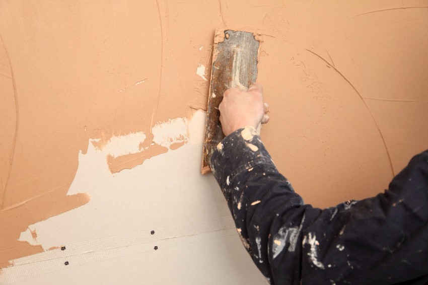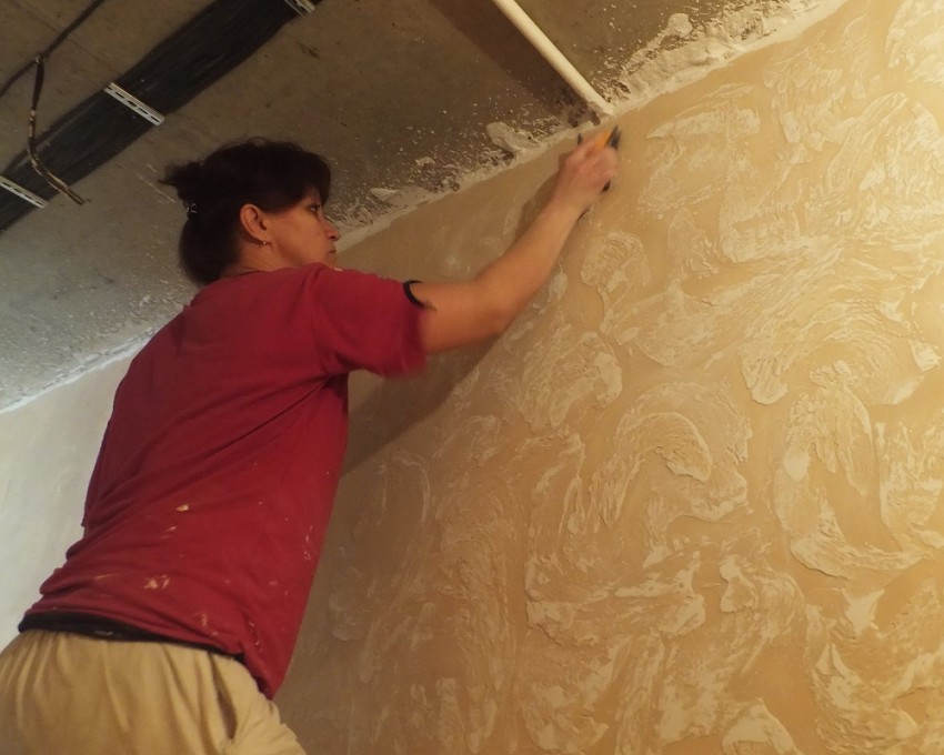 Декорирование. Используют ту же самую штукатурку, что на основе. Кельмой на стену кладут и разравнивают раствор толщиной 2-3 мм. Сразу же, не дожидаясь высыхания, создают рельефную поверхность.