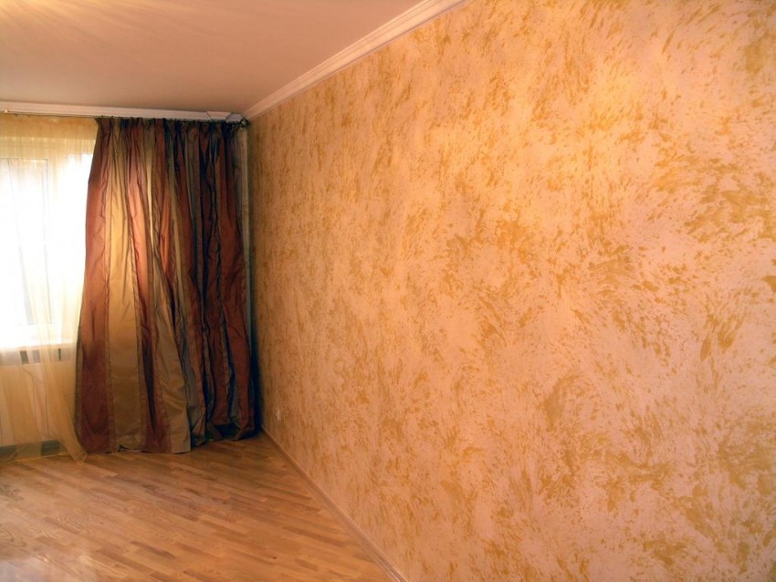 Возможно, самый популярный вариант текстуры, который широко используется как в квартирах, так и частных домах. Отличается более сложной технологией нанесения – требуется нанести не менее 3 слоев (в идеале более 5), каждый из которых после усиленно обрабатывать для достижения ярко выраженного эффекта железнения. В итоге, когда поверхность стены уже достаточно просохла, следует обработка воском. Многие ласково называют такую штукатурку “венецианкой” – что ж, похоже именно этот ее вид и можно полноправно называть народным.