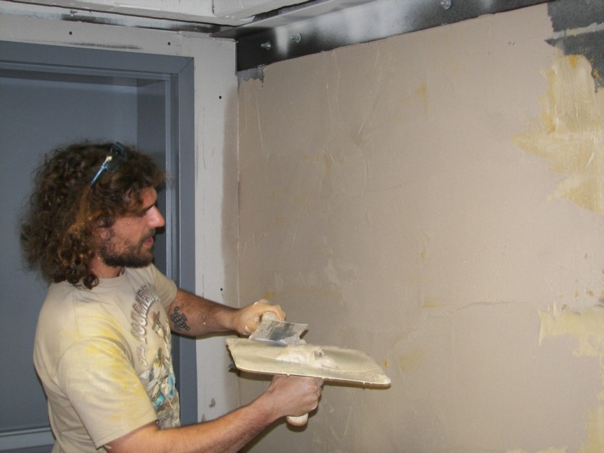 Затем необходимо разгладить штукатурку с помощью специальной гладилки. Чтобы создать качественную и красивую фактуру, слой материала на стене должен составлять примерно 1.5 миллиметра. Особенно внимательно нужно работать с углами поверхности, чтобы ничего не упустить и не сохранить структуру. Наносить и распределять штукатурку по стене следует узкими шпателями.