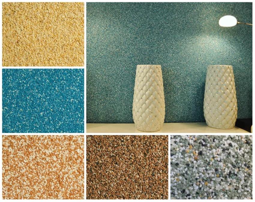 - Эстетичный внешний вид. Специальные добавочные материалы в составе играют решающую роль в формировании необычной структуры. Мелкая каменная крошка и другие различные вкрапления позволяют повторять структуру мраморного или песчаного покрытия. В последнее время все более популярной становится штукатурка, позволяющую воссоздать структуру кожуры апельсина или поверхность, которая подверглась воздействию насекомых. Цветовая палитра также довольно обширна и позволит удовлетворить любой запрос покупателя. В связи с этим определиться с конечным выбором довольно сложно, поэтому производители создали каталоги с различными вариантами структуры.