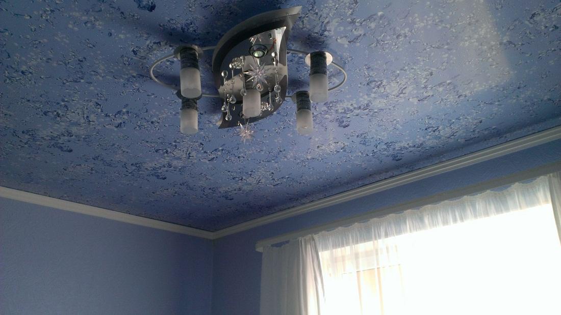 Помимо заказного навесного потолка вполне доступно оформление своими руками индивидуального варианта подходящего к определенному дизайну помещения. Добиться декоративного, узорчатого полотна можно при использовании специальных фактурных красок или штукатурок. Подходящей основой под них будет любой обычный тканевый натяжной потолок – его полотно подходит для многоразовой покраски.