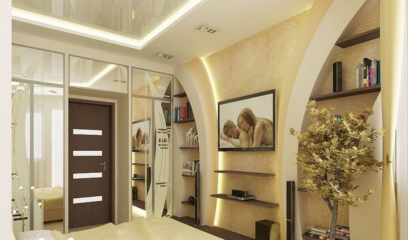 Фигуры на стенах могут быть еще более разнообразными, плавно переходить в арки, ниши, совмещаться с дизайнерскими полками.