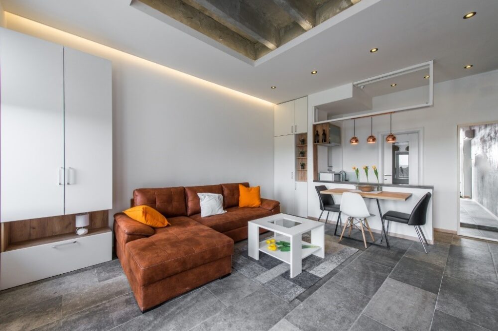 Белый цвет разбавляет основной серый тон и обеспечивает визуальное увеличение комнаты