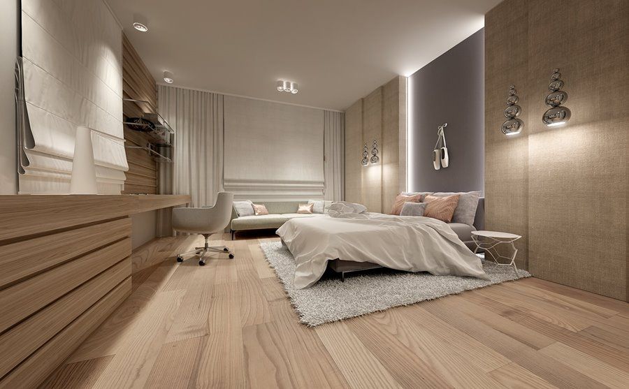 При умелом сочетании различных фактур другой декор не понадобится. Для стен рекомендуется использование нейтральных приглушенных оттенков. Мелкозернистая штукатурка не будет утяжелять пространство, зону с кроватью можно выделить пробковой или деревянной отделкой. Для оформления полов рекомендуется выбирать ламинат или паркет, еще одним вариантом является однотонный ковролин. А вот от ковриков лучше отказаться, это позволит оставить в комнате ощущение открытого пространства.